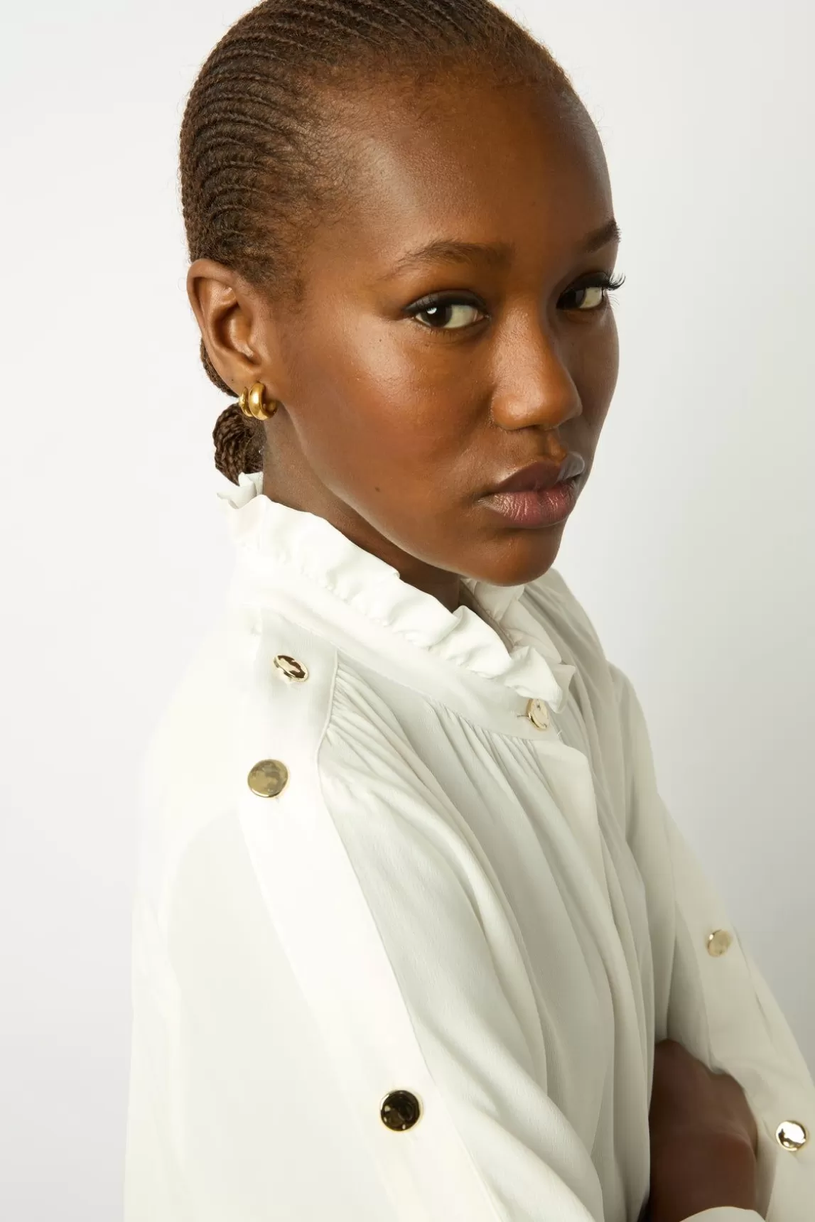 Chemise Fluide À Col Montant Dans Un Mélange Contenant De La Soie. Epaules Et Bras Ornés De Boutons Dorés.